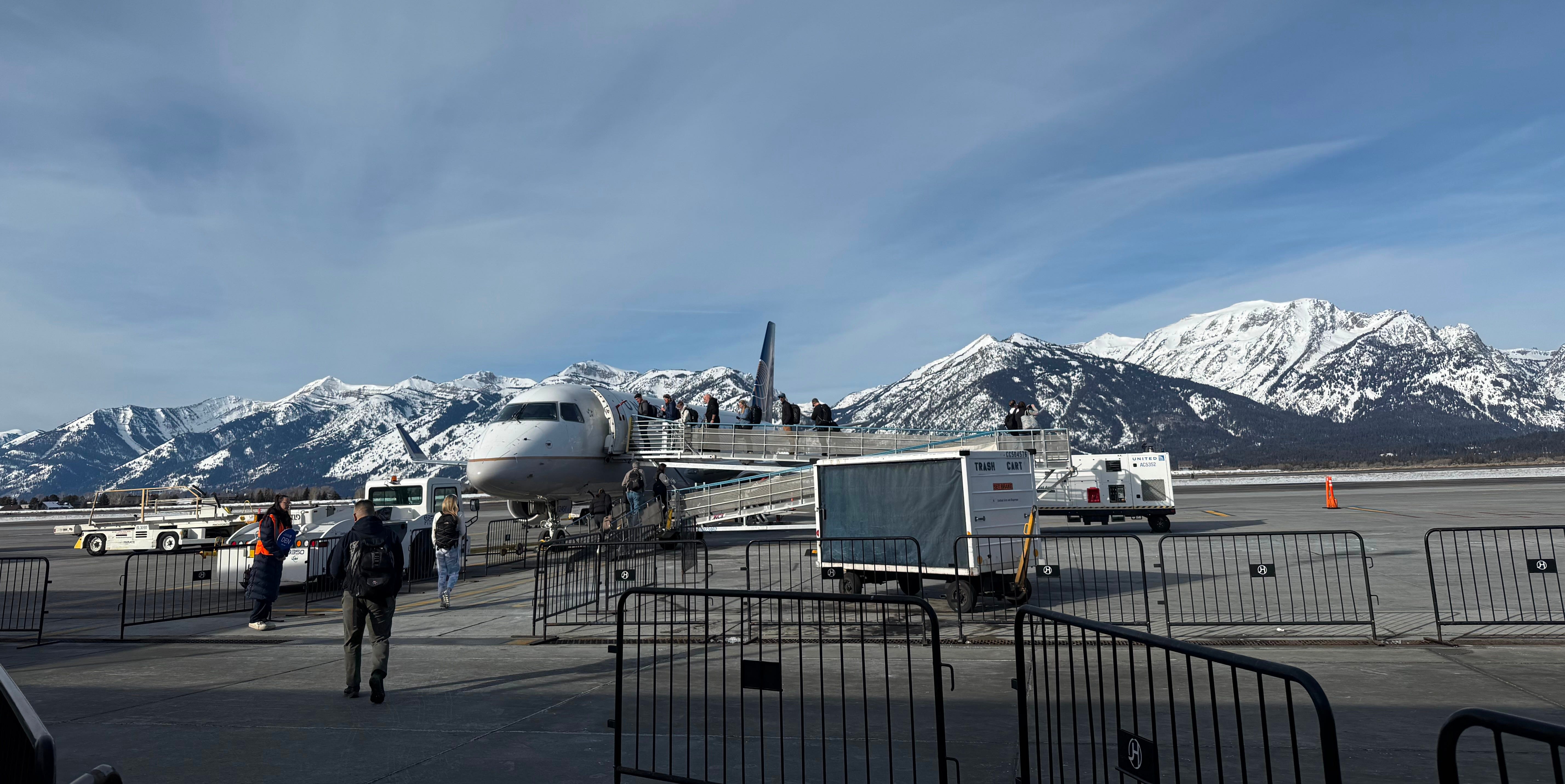 Jackson Hole airport has to be one of the most beautiful airports I’ve ever seen. It’s quite small (only eleven gates), yet the interior feels like a newly furnished cabin: lacquered wood, fireplaces, caramel pleather seating, and floor-to-ceiling windows that frame snow-covered mountains. The income per capita in Teton County is unmistakably reflected in the airport itself.