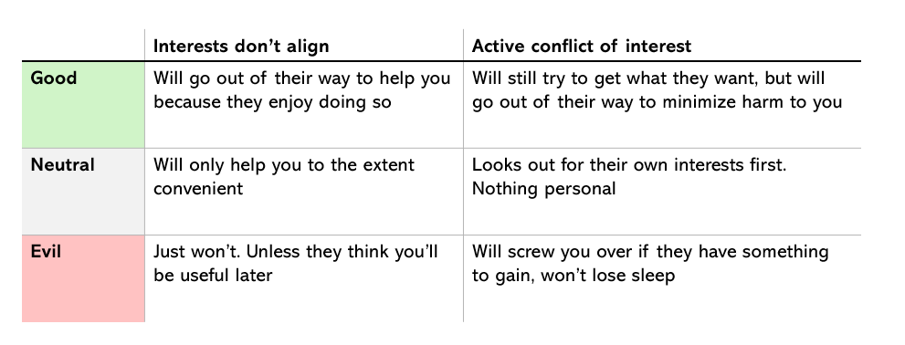 Evil: May help you when interests align, but will actively screw you over if it benefits them