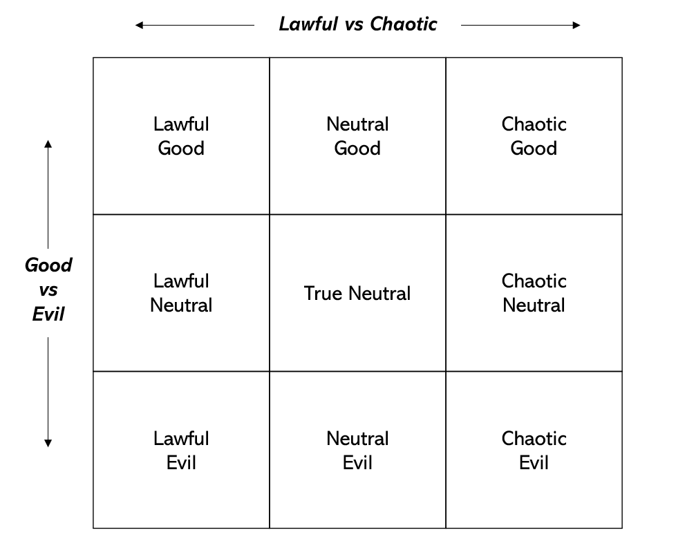 You might recognize this from the memes. Specifically, let me draw your attention to the Good-Neutral-Evil axis. Here’s how I think of the definitions: